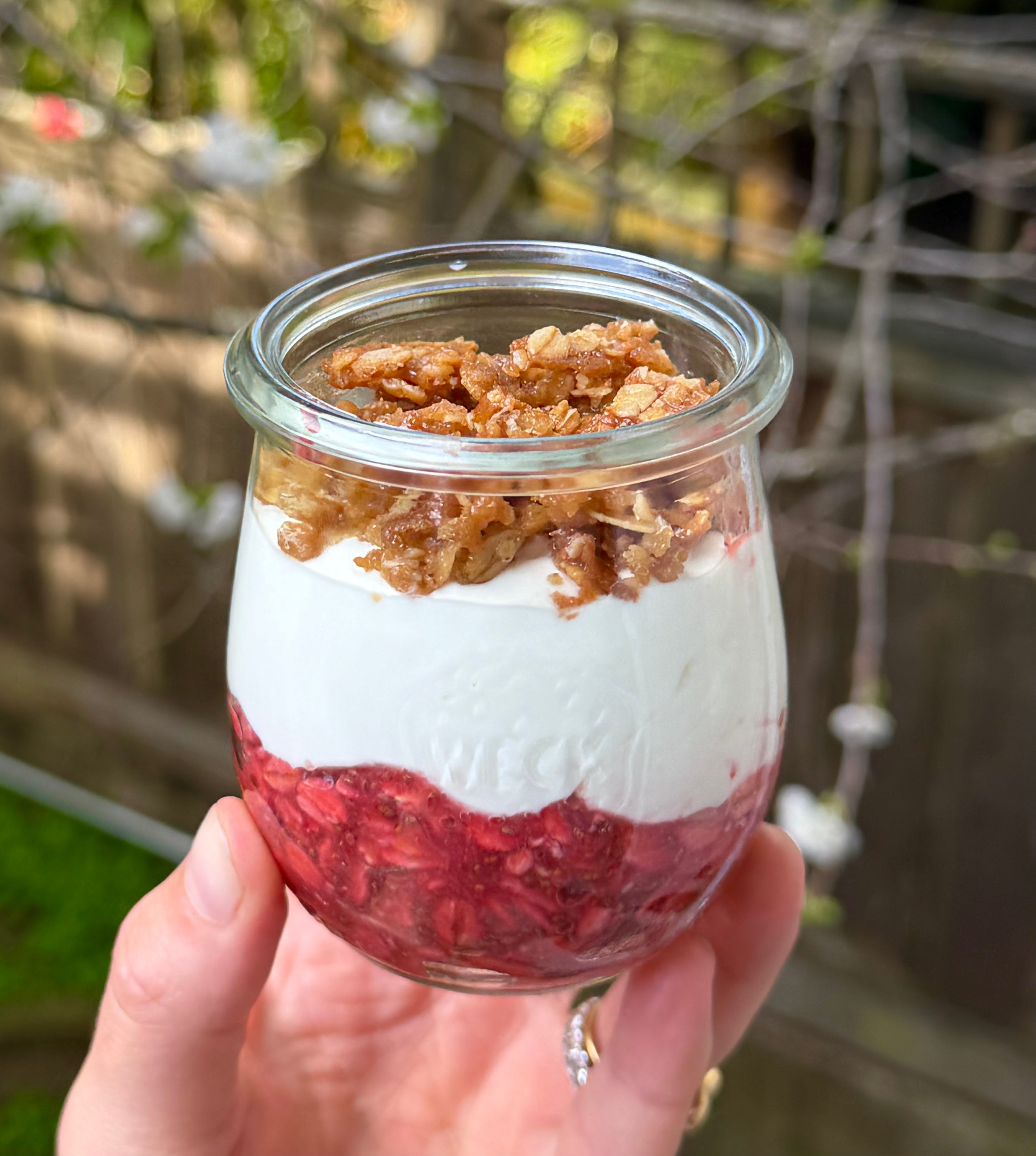 Bright fresh strawberry oats layered with skyr and a crunchy graham topping!